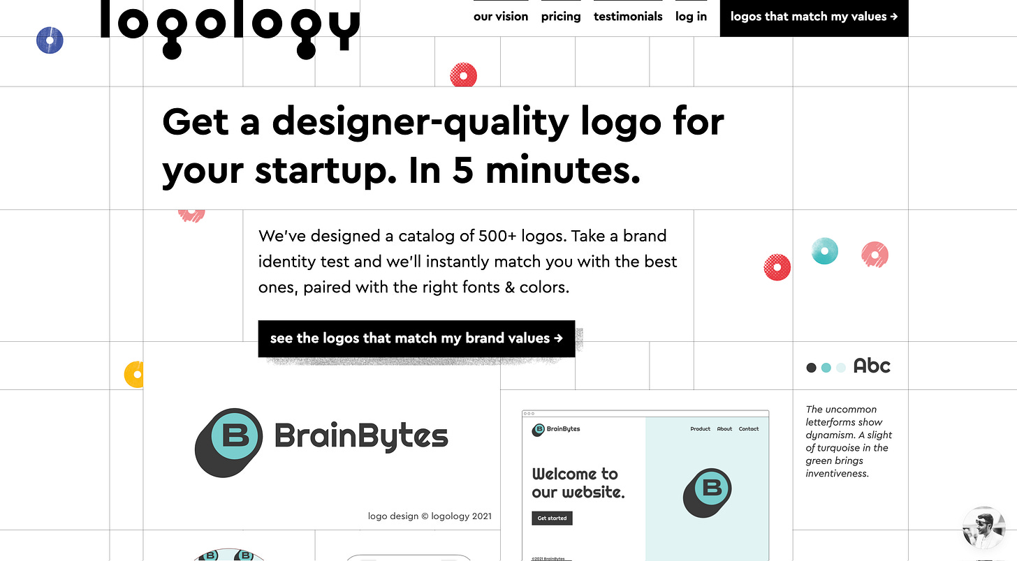 This last one isn’t quite a design tool like the others. It’s not 100% self-serve. Dagobert and his wife, Lucie, have designed a catalog of 500+ logos. As someone looking for a logo, you take a brand identity test and they’ll instantly match you with the best ones, paired with the right fonts & colours.