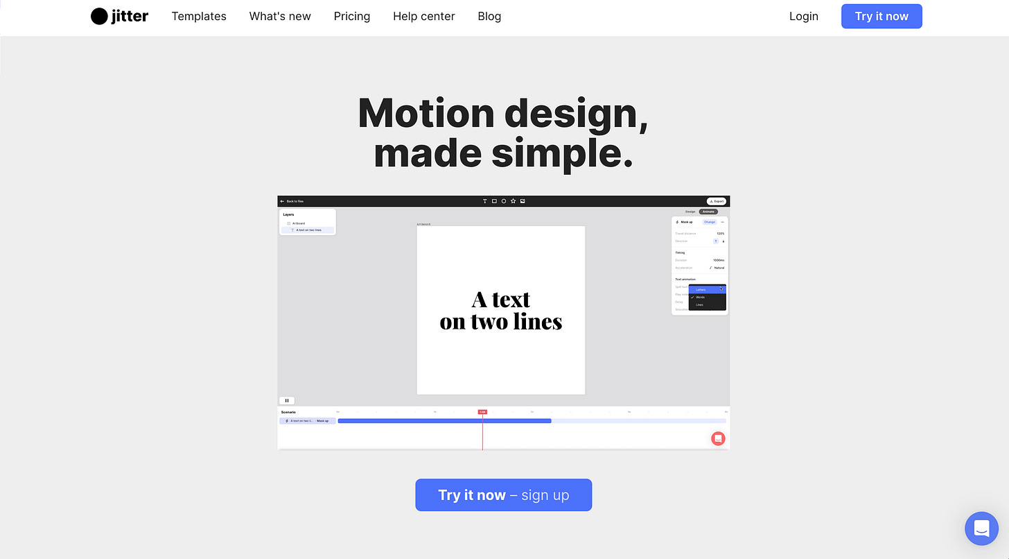 Jitter is like Figma for motion design: it makes it easy to create animations for your videos, websites or apps, all in the browser.
