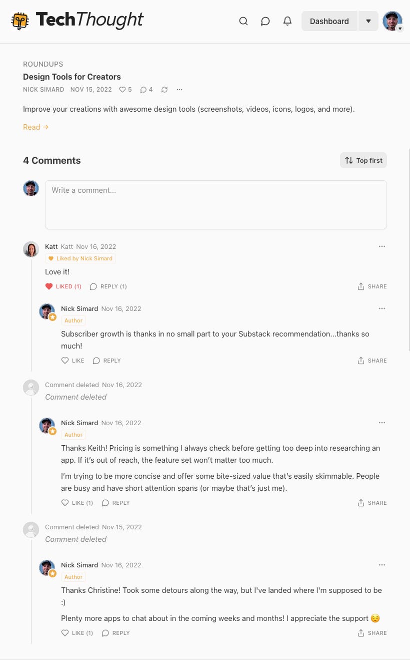 This post was originally published on November 15, 2022 in another Substack publication of mine, TechThought. I've added a screenshot of the comments at the bottom of this post, for archival purposes :)Welcome to the seventh issue of App Chat, the newsletter for busy creators in search of the perfect no/low-code tech stack.