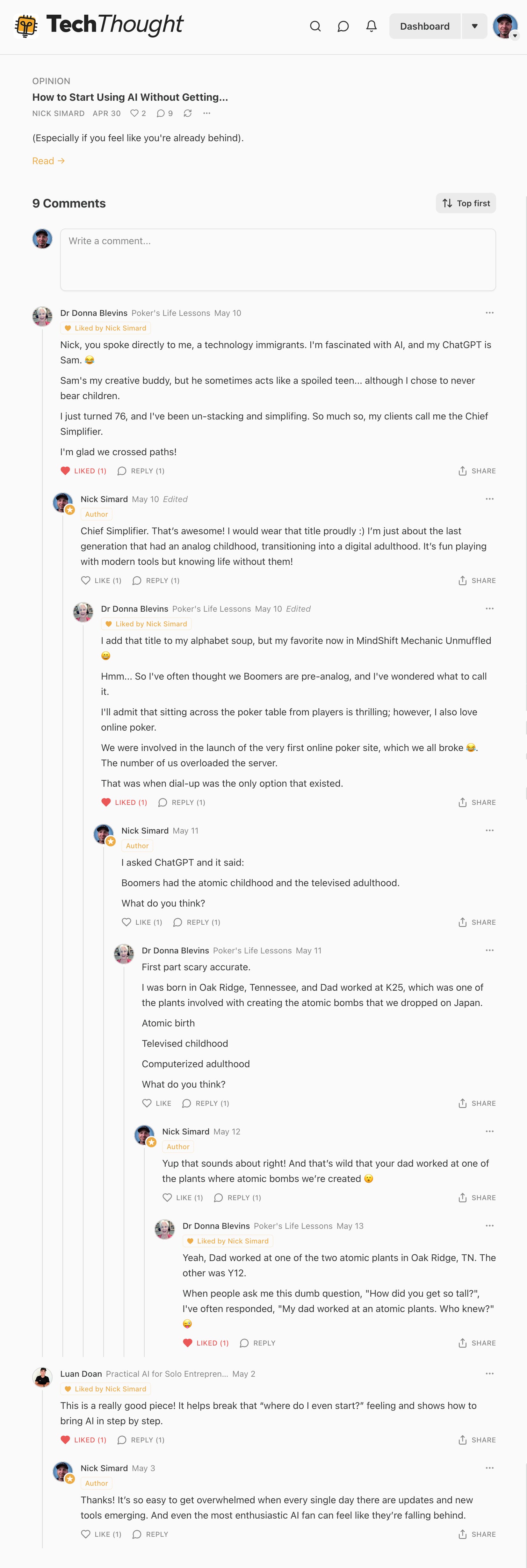 This post was originally published on April 30, 2024 in another Substack publication of mine, TechThought. I've added a screenshot of the comments at the bottom of this post, for archival purposes :)If you’ve ever tried to dip your toe into the world of AI tools, you’ve probably felt it—the flood of jargon, the pressure to “10x your output,” the endless stream of newsletters and videos promising to unlock your productivity superpowers.