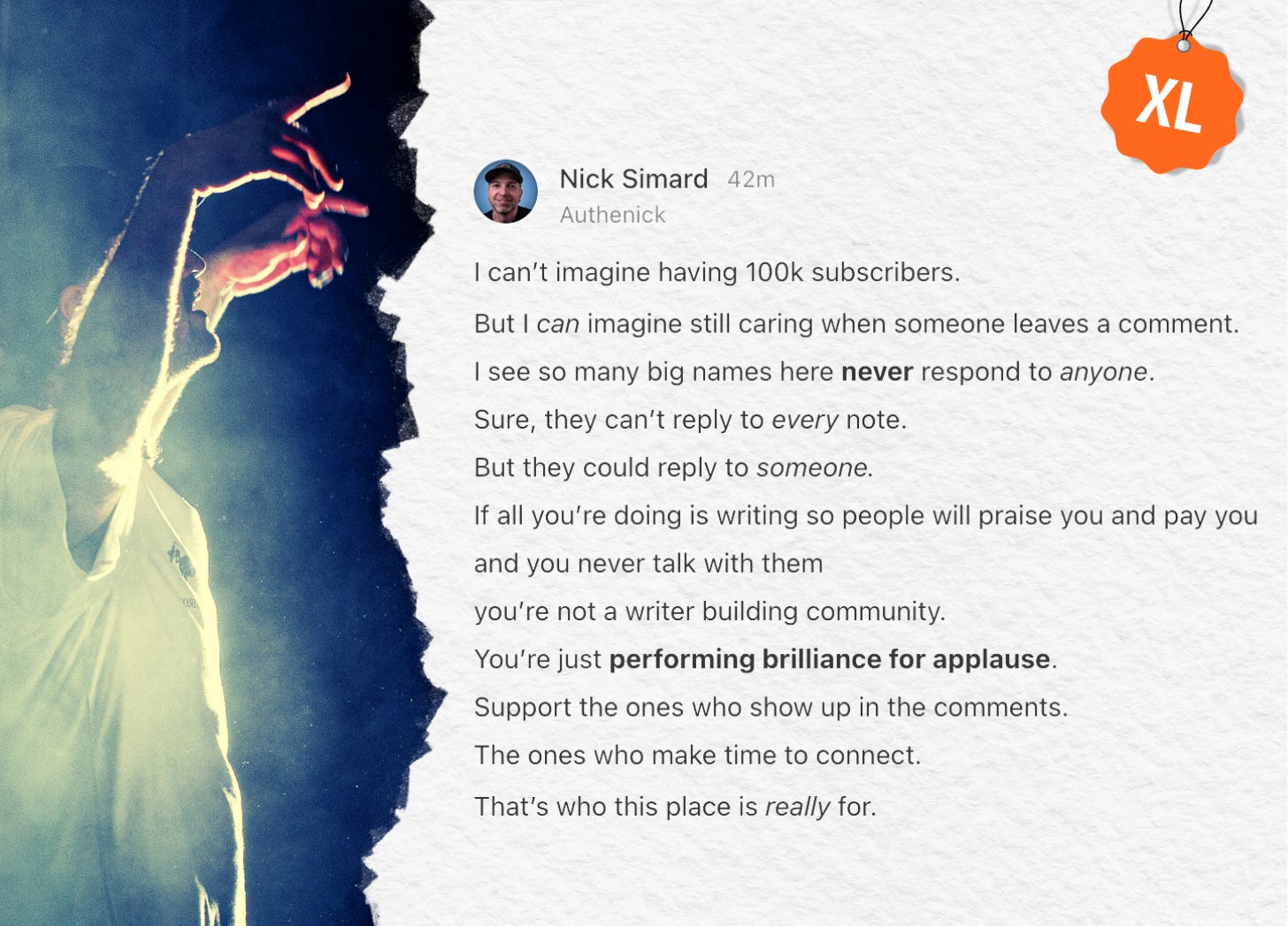 This began as a Note but I couldn’t let go of the words “performing brilliance for applause” so I decided to make it into an “XL Note”.There’s a strange quiet under some of the loudest voices on Substack.